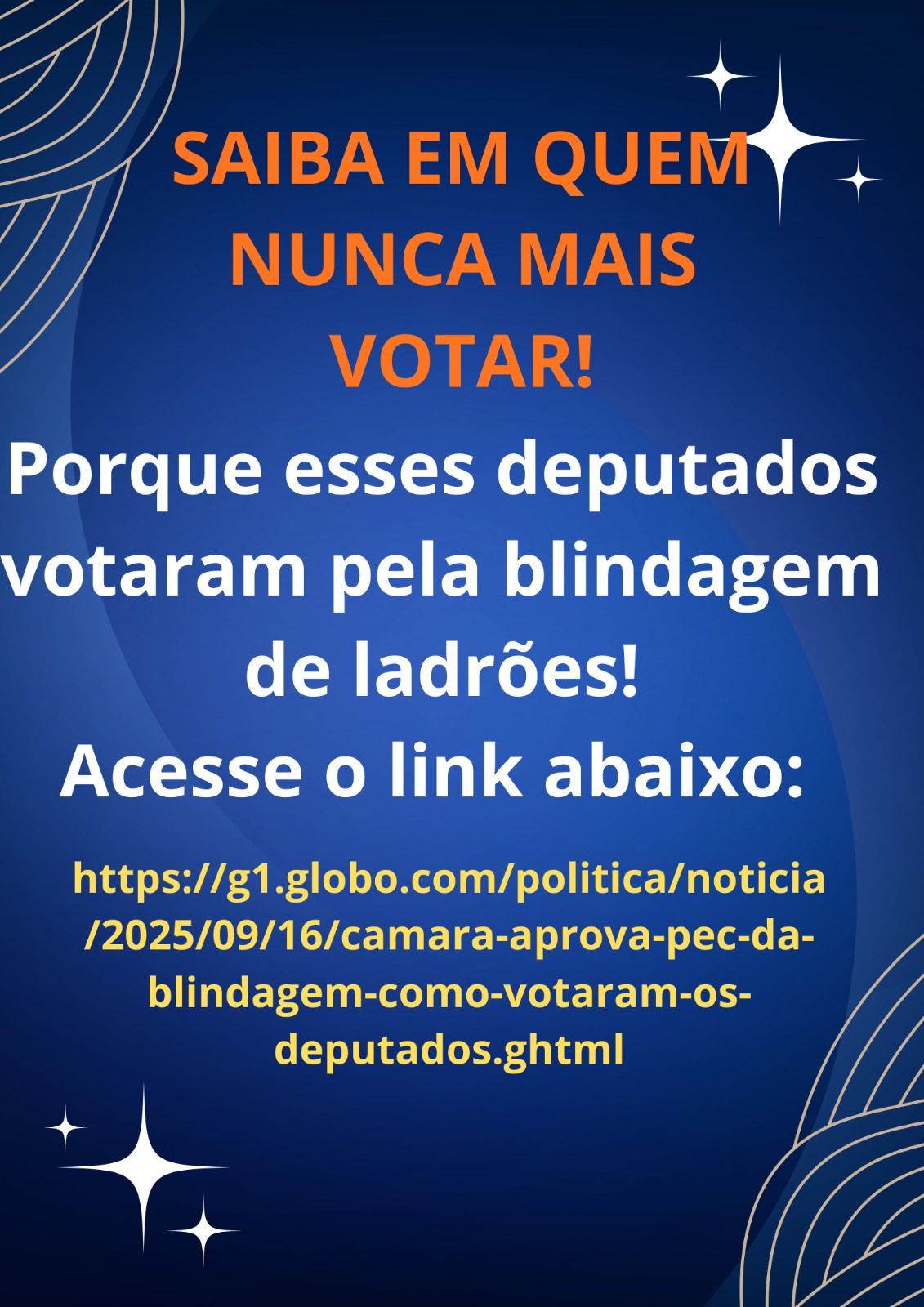 Acesse o link e saiba quem votou contra o povo brasileiro: https://g1.globo.com/politica/noticia/2025/09/16/camara-aprova-pec-da-blindagem-como-votaram-os-deputados.ghtml